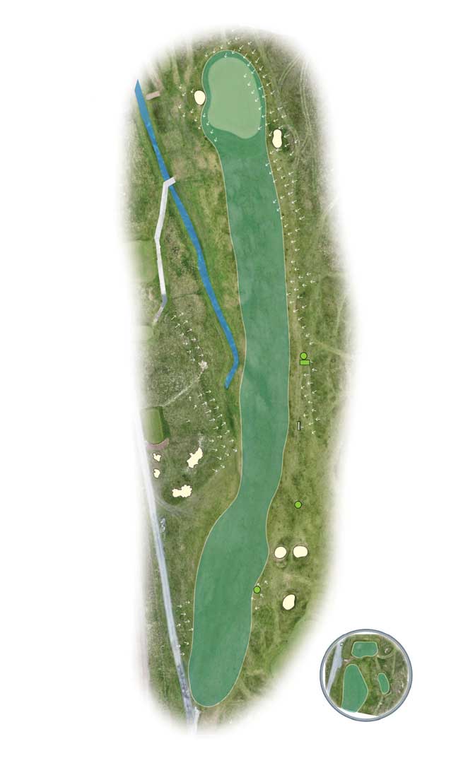 Aim for the right side of the fairway for a clear view of the green on this challenging par 4. Beware of fairway bunkers lining the right side and ensure precise club selection for the approach to the expansive green, granting priority to players on the 2nd green.