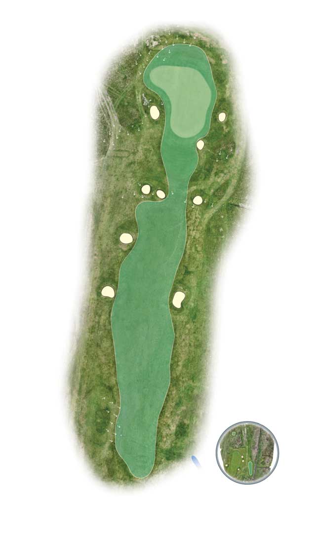 Choose the conservative approach with a long iron or fairway wood to avoid the array of fairway bunkers. Rely on precise wedge play for a chance of a birdie on this challenging par 4.